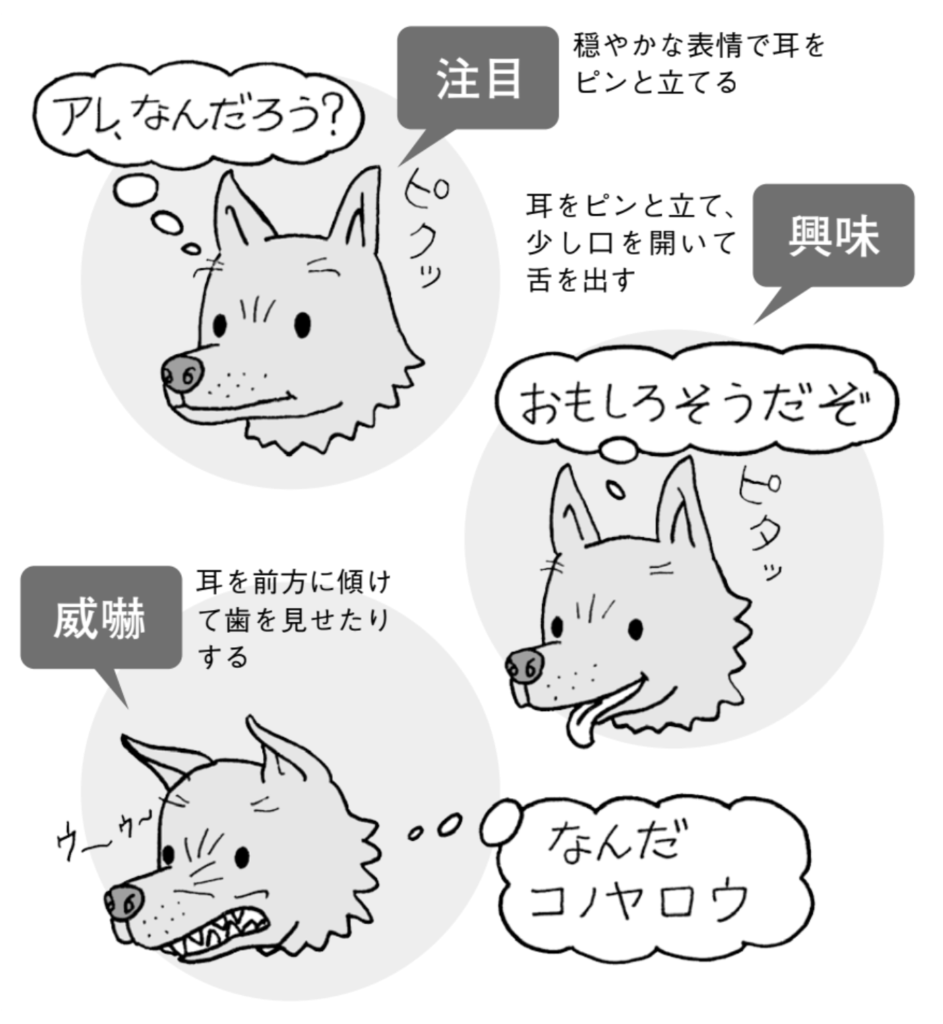 同じピンでも、耳を前方にやや傾けて歯を見せたり鼻や唇にシワが寄っている場合は、威嚇や自分の存在を誇示している証拠。たれ耳の犬でも耳に力が入り、水平方向に少し持ち上がっているはずです。