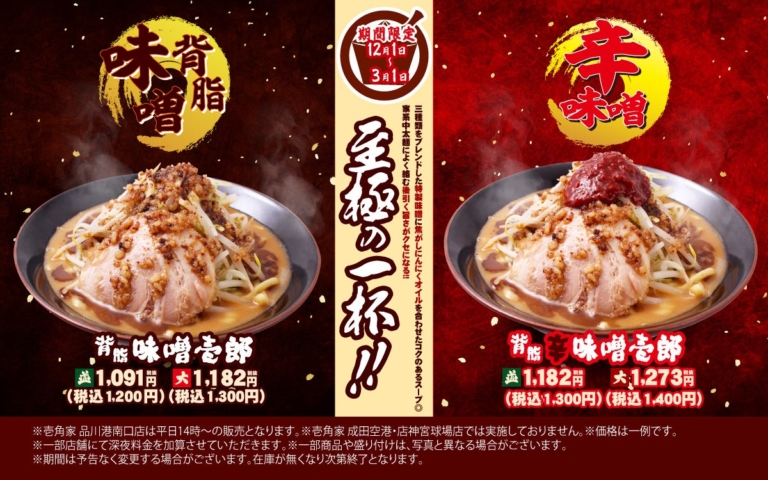 株式会社ガーデン2025年12月1日(月)から2026年3月1日(日)に全国の壱角家※で販売 株式会社ガーデン(本社:東京都新宿区 代表取締役社長:川島賢 以下「当社」)が運営する「壱角家」は、2025年12月1日(月)から2026年3月1日(日)の期間限定で、『背脂味噌壱郎』と『背脂辛味噌壱郎』を全国の壱角家店舗※で販売いたします。