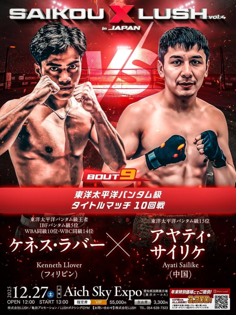 株式会社LUSHVIP席55,000円、自由席3,300円の2種類のみの発売。2025年12月27日(土)愛知国際展示場にて開催。 ボクシングと音楽とグルメが融合した新時代のスポーツエンターテインメント「SAIKOU × LUSH」は2025年12月27日(土)に愛知国際展示場(展示ホールA)にて「SAIKOU × LUSH vol.4 in JAPAN」を開催いたします。