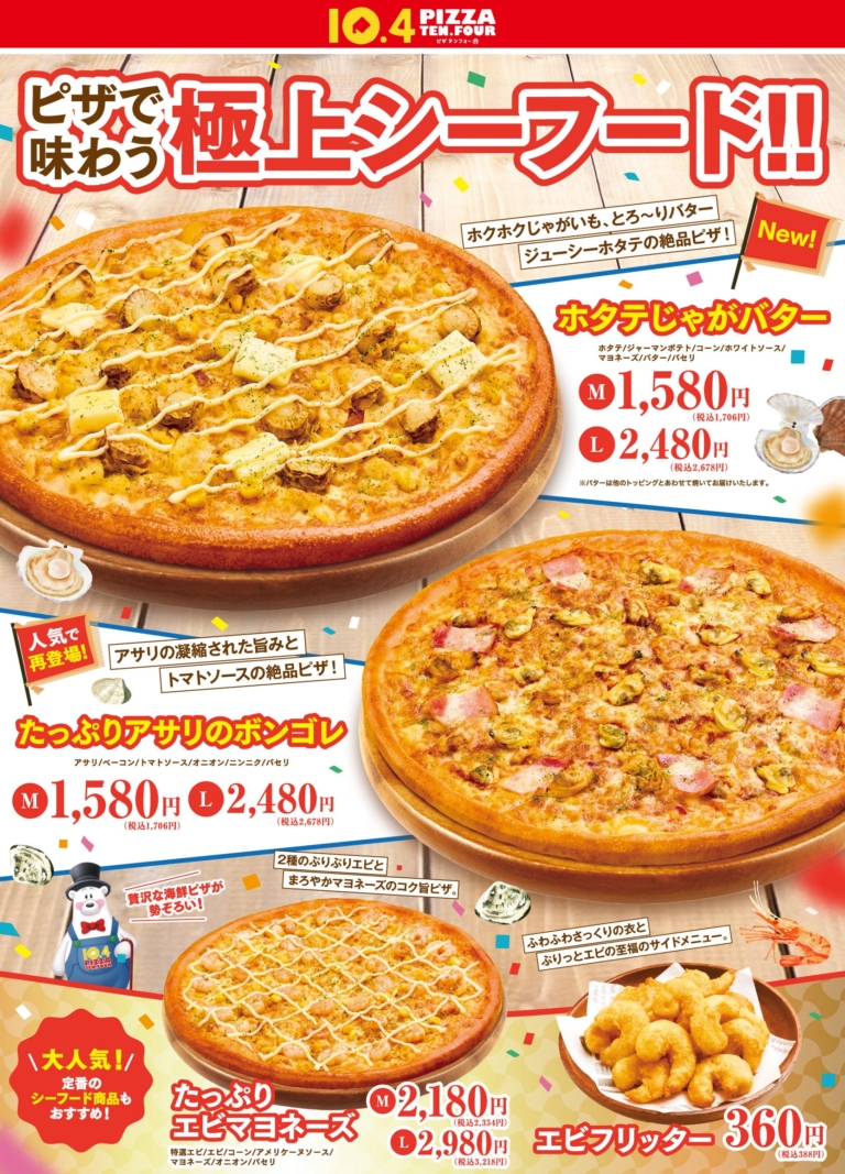 株式会社テンフォー ~第104代肉横綱、北海道チーズドリア 天使のオーブンでも新商品登場~ 北海道生まれの宅配ピザチェーン10.4(テンフォー)を運営する、株式会社テンフォー(本社・北海道函館市/代表・高橋仁志)は、ジューシーなホタテとホクホクのじゃがいも、濃厚なバターをあわせたピザ『ホタテじゃがバター』を2026年1月31日(土)より発売いたします。また昨年、期間限定で販売し再販売のリクエストの多かったピザ『たっぷりアサリのボンゴレ』をあわせて復刻販売いたします。