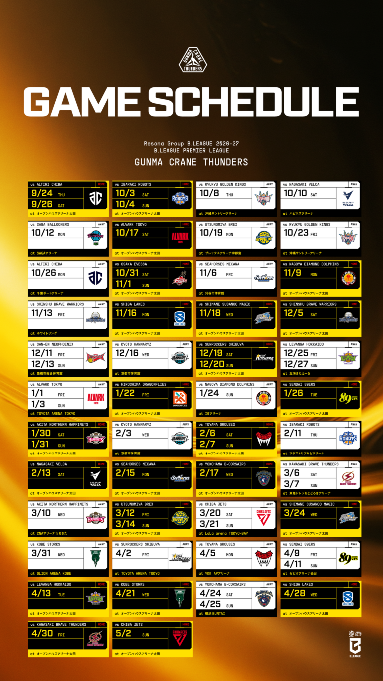 株式会社群馬クレインサンダーズいつも群馬クレインサンダーズに温かい声援をいただき誠にありがとうございます。 りそなグループ B.LEAGUE 2026-27 B.LEAGUE PREMIER、群馬クレインサンダーズの対戦相手、試合日、試合会場が決まりましたので、お知らせします。 なお、2026年9月22日~2027年1月3日の期間の試合開始時間については、2026年7月頃にBリーグより発表予定です。