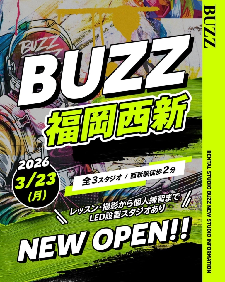 株式会社BUZZ GROUP総会員数40万人突破のBUZZが福岡西新エリアに進出!白×ラインLED・青のデザインLEDなど個性豊かな全3スタジオ。2026年3月23日(月)オープン 全国84店舗以上を展開するレンタルスタジオ「BUZZ(バズ)」を運営する株式会社BUZZ GROUP(本社:東京都港区、代表取締役:渡辺 憲)は、新店舗として「BUZZ福岡西新」を2026年3月23日(月)にオープンいたしました。総会員数40万人突破・月間利用者数25万人以上を誇るBUZZが、福岡エリア6店舗目として…