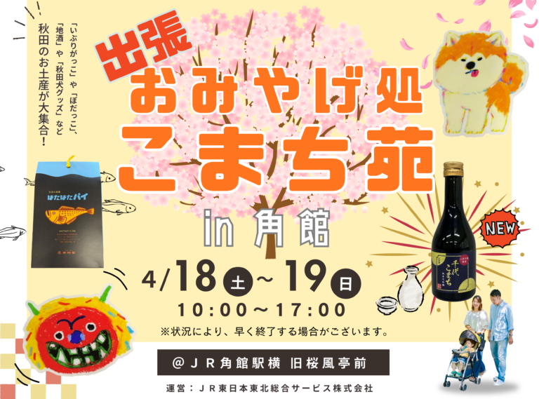 JR東日本東北総合サービス株式会社2026年4月18日・19日の2日間、JR角館駅横の旧桜風亭にて臨時営業を実施します!秋田のお土産や雑貨、お酒を販売し、「千代こまち 純米大吟醸」(300ml)を新たに発売します。 JR秋田駅2階で土産物販売店「おみやげ処 こまち苑」を運営するJR東日本東北総合サービス株式会社(本社:宮城県仙台市、代表取締役社長:弭間 俊則)は、2026年4月18日(土)~19日(日)にJR角館駅で「出張 おみやげ処 こまち苑」を開催します。秋田県内のお土産や雑貨、地酒などを…