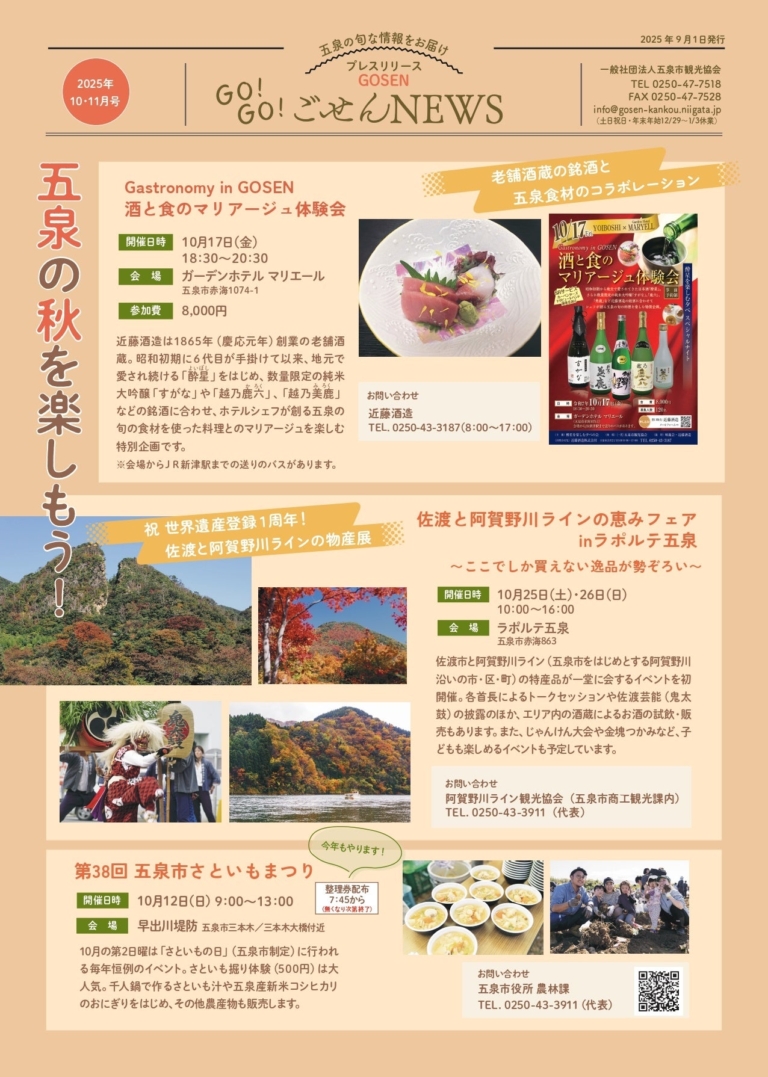 公益社団法人 新潟県観光協会一般社団法人五泉市観光協会は、五泉市の旬な観光・グルメ・イベント情報をお届けするプレスリリース「GO!GO!ごせんNEWS」の10・11月号を発行しました。