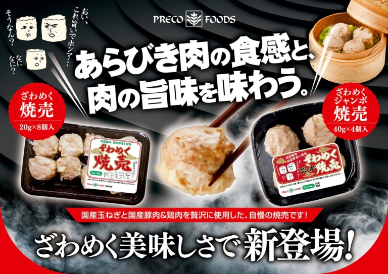 株式会社プレコフーズ国産玉ねぎと国産豚肉・国産鶏肉を贅沢に使用。皮は小麦粉とタピオカ粉でつるんとした舌触り、しっとりもちもちとした食感。 総合食品卸の株式会社プレコフーズ(本社:東京都品川区、代表:高波 幸夫※1)は、2025年8月より『ざわめくジャンボ焼売』『ざわめく焼売』をスーパーマーケット(※2)で順次販売し、大変ご好評をいただいております。