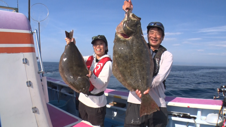 テレビ大阪株式会社テレビ大阪製作「THEフィッシング(ザ・フィッシング)」9月6日(土) 夕方5:30~テレビ東京系列全国6局ネットで放送 左から杉野美星(すぎの びせい)・福田豊起(ふくだ とよき)、ヒラメ (C)テレビ大阪