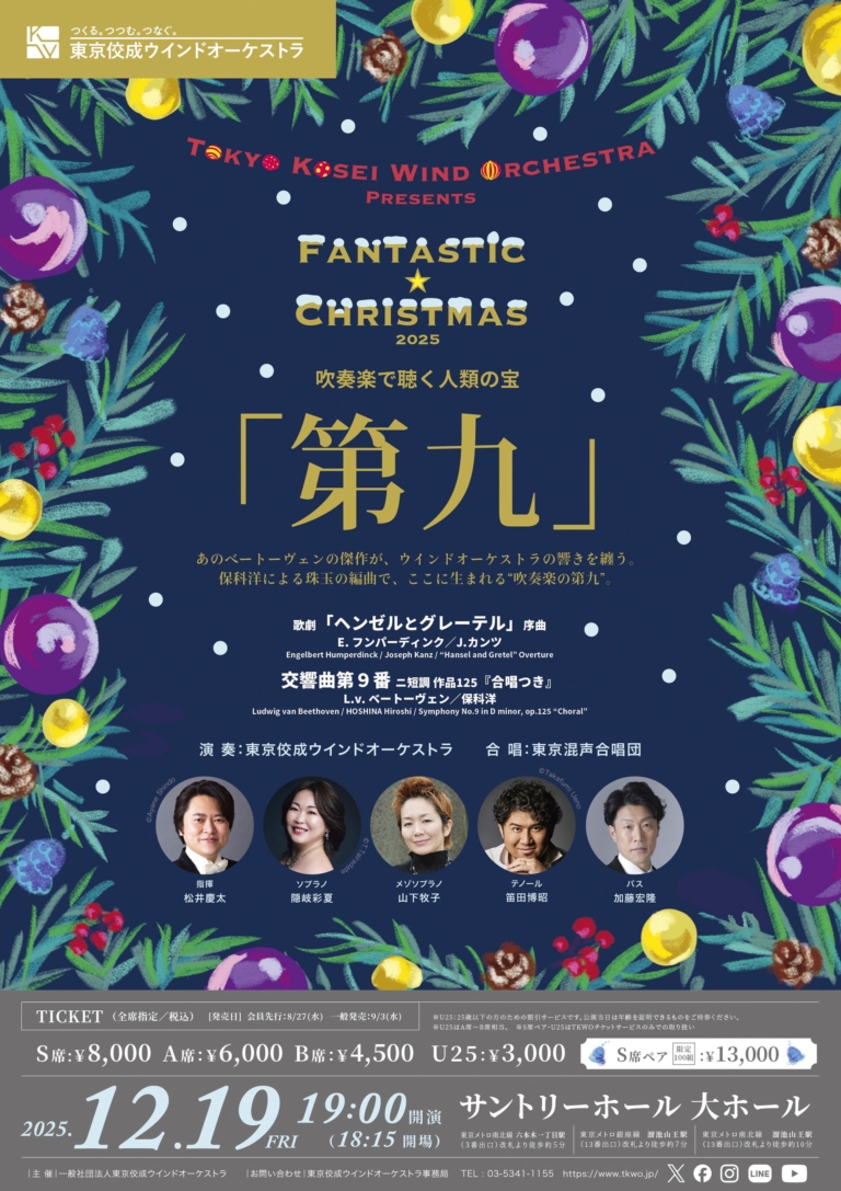 一般社団法人東京佼成ウインドオーケストラ『ファンタスティック☆クリスマス2025』~吹奏楽で聴く人類の宝「第九」のチケットは、9月3日(水)発売開始!お聴き逃しなく! 一般社団法人東京佼成ウインドオーケストラ(東京都杉並区、理事長:勝川本久)は、2025年12月19日(金)19時~サントリーホール大ホールにて、『ファンタスティック☆クリスマス2025』~吹奏楽で聴く人類の宝「第九」を開催いたします。