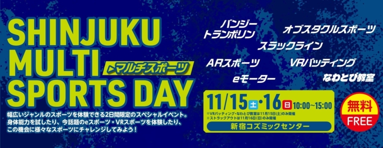 公益財団法人新宿未来創造財団11月15日(土)・16日(日)、幅広いジャンルのスポーツを体験できるスペシャルイベントを開催します! 11月15日(土)・16日(日)に、幅広いジャンルのスポーツを体験できるイベント「SHINJUKU MULTI SPORTS DAY(新宿マルチスポーツデー)」を開催します。身体能力を試したり、今話題のeスポーツ・VRスポーツを体験したり、この機会に様々なスポーツにチャレンジしてみよう!