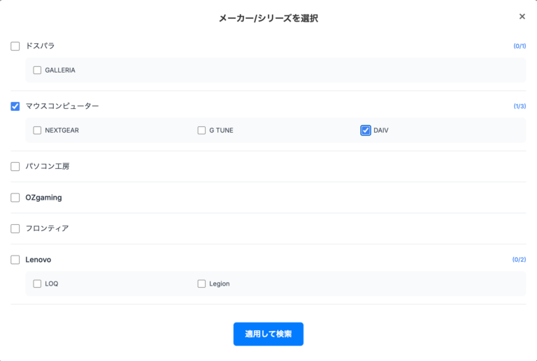 gg内におけるメーカー/シリーズ選択画面のスクリーンショット