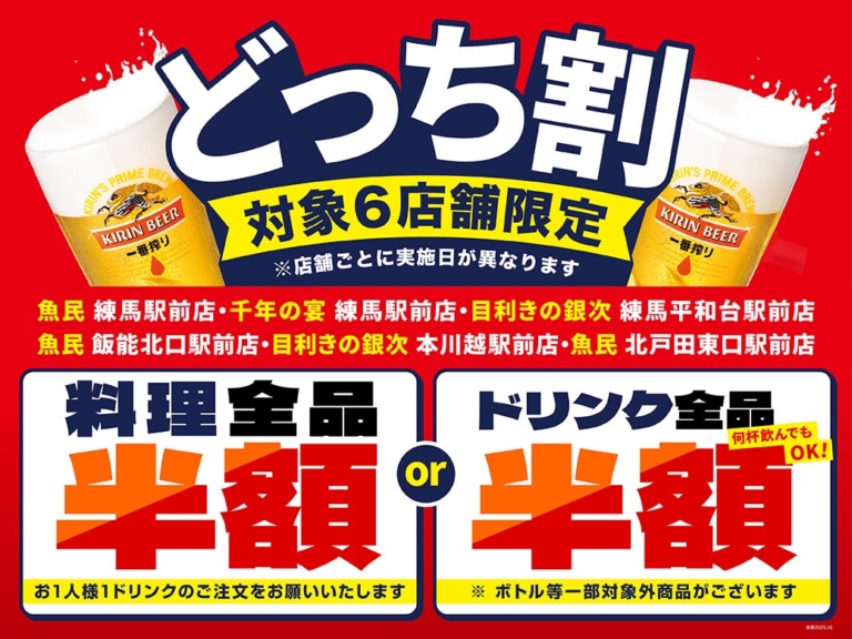 株式会社モンテローザ食事でも飲み会でも、ご利用シーンに合わせて選べる“どっち割”で、この機会にぜひご来店ください! 「白木屋」「魚民」「目利きの銀次」などを全国に展開する株式会社モンテローザ(本社:東京都杉並区、代表取締役:大神輝博)は、地域で一番愛される店舗づくりに日々努めてまいりました。長年のご愛顧に感謝の気持ちを込めて、対象の6店舗限定で「料理全品半額」または「ドリンク全品半額」を選べる“どっち割”セールを実施いたします。お食事メインでも飲み会メインでも、ぜひこの機会にご来店ください!