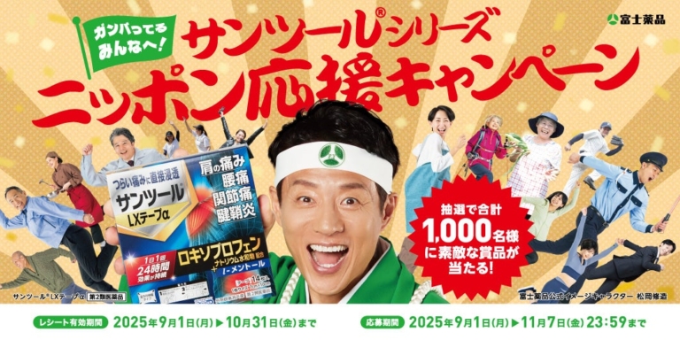 株式会社富士薬品~レシート応募で松岡修造さんグッズなど1,000名様に当たる~ 医薬品の開発から製造・販売までを行う複合型医薬品企業の株式会社富士薬品(本社:埼玉県さいたま市 代表取締役社長:高柳 昌幸、以下「富士薬品」)は、2025年9月1日(月)から10月31日(金)までの間、「サンツール(R)シリーズ ニッポン応援キャンペーン」を開催します。 「サンツール(R)シリーズ ニッポン応援キャンペーン」では、期間中に「セイムス」をはじめとする富士薬品グループのドラッグストアおよび富士薬品の配置…