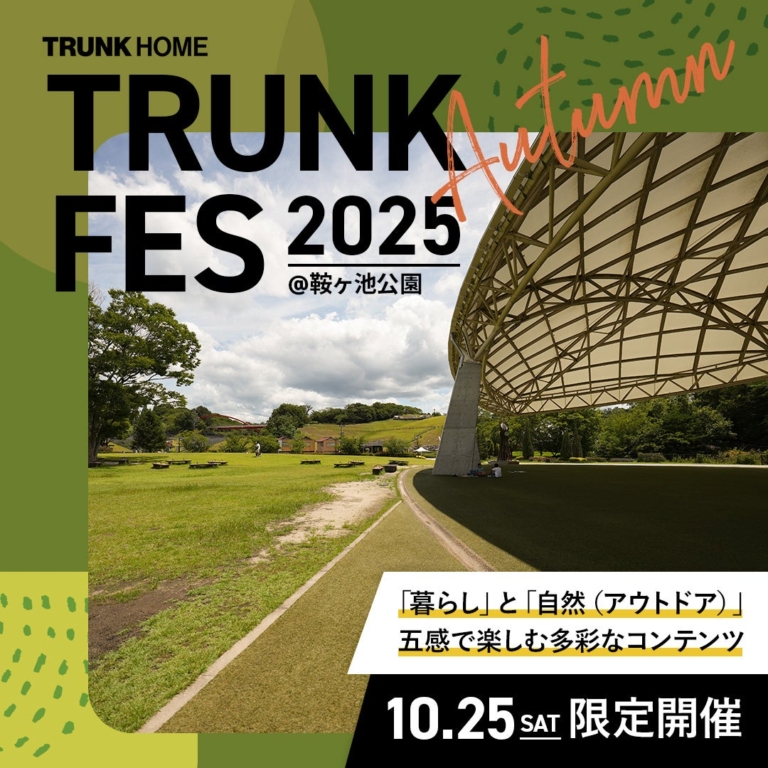 株式会社TRUNK HOME「暮らし」と「自然(アウトドア)」をテーマに、株式会社TRUNK HOMEが、2025年10月25日(土)に「TRUNK FES 2025 in 鞍ヶ池」を開催します。 庭のある暮らしの提案を軸に、自然あふれる鞍ヶ池公園で、家族や地域がつながる様々な体験と交流の場を提供します。 イベント名