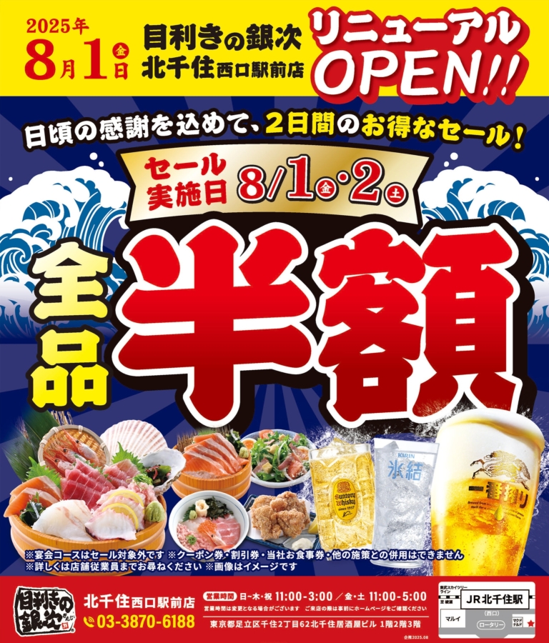 北千住で海鮮を半額で!2日間限定全品半額セール&お得なランチ登場「目利きの銀次 北千住西口駅前店」が8月1日リニューアルオープン!