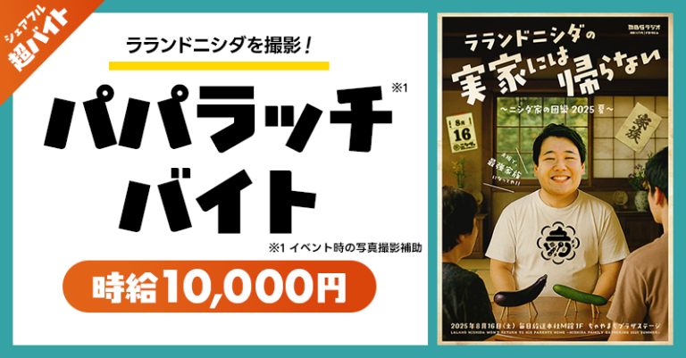【急募】時給1万円&番組グッズ付き!ラランドニシダ専属“パパラッチ!?”の仕事!『ラランドニシダの実家には帰らない』初イベントでニシダを激写する超バイトをシェアフルが募集!8/16大阪で夢の体験