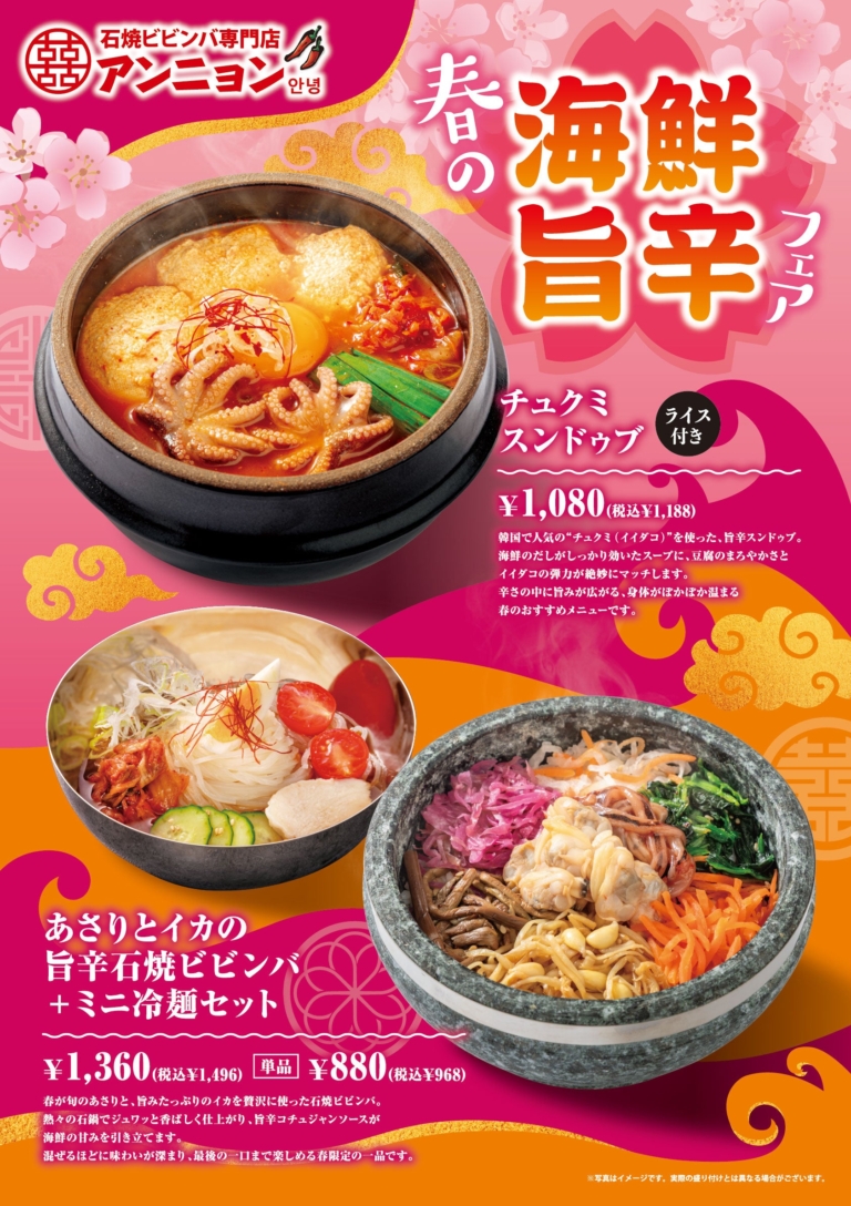 焼肉坂井ホールディングス~ 韓国で人気グルメと旬な海鮮の美味しさをお楽しみください ~ 石焼ビビンバ専門店「アンニョン」では3月5日(木)より「春の海鮮旨辛フェア」を開催いたします。韓国で人気の“チュクミ(イイダコ)”を使用した旨辛スンドゥブに春の旬な海鮮食材・あさり、イカなどを使用した旨辛石焼ビビンバでございます。韓国の食のトレンドと旬な食材の美味しさをお楽しみください。また、3月19日(木)までフェアメニューご注文のお客様にソフトドリンク1杯無料キャンペーンも行います。※どうぞこの機会にご…