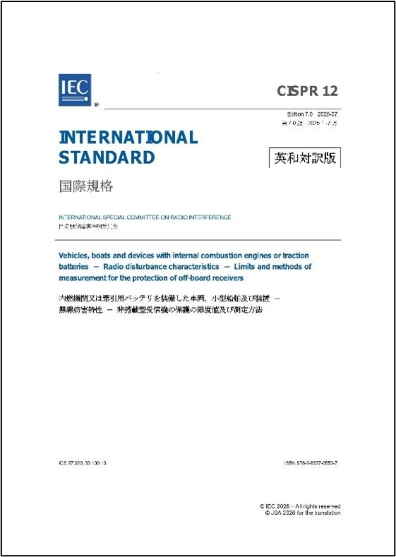【自動車業界の方必携!】CISPR 12 Ed. 7.0:2025 内燃機関又は牽引用バッテリを装備した車両,小型船舶及び装置-無線妨害特性-非搭載型受信機の保護の限度値及び測定方法の邦訳版を発行