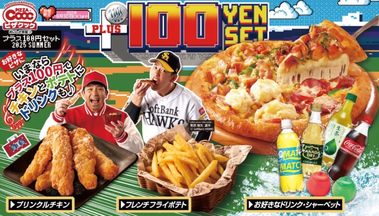 株式会社イワタダイナース ピザクック(運営元:(株)イワタダイナース 代表:原野拓郎)は、毎年大人気の、夏のプラス100円セットを実施します。今年のプラス100円セットはチキンとポテト、さらにドリンクまたはシャーベットがついてきます。しかも、チキンは今までのフライドチキンから、食べ始めたら止まらない魔法のチキン「プリンクルチキン」にグレードアップしました!