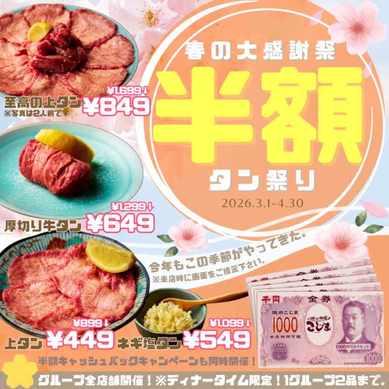 【焼肉こじま】伝説の「春のタン祭り」が3/1開幕!上タン・厚切りタンが“半額”&お会計の半分を金券キャッシュバックする衝撃のW還元