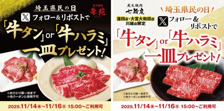 株式会社サリックストラベル炭火焼肉朱苑または炭火焼肉七輪房(大宮大和田店、川越店、蓮田店)のXをフォロー&リポストまたは、店舗限定LINE配信されたクーポンのご掲示で牛タンor牛ハラミがもれなく一人一皿プレゼント!! 株式会社サリックストラベル(本社:埼玉県さいたま市、代表取締役社長:柳 朱理)が運営する炭火焼肉朱苑(浦和高砂店・新座店)、炭火焼肉七輪房(大宮大和田店・川越店・蓮田店)の5店舗限定企画となります。 2025年11月14日(金)から2025年11月16日(日)までの三日間、15時…