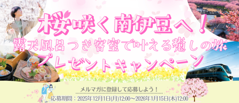 抽選で3組6名様をご招待!南伊豆の桜&露天風呂つき客室に泊まる旅が当たる「メルマガに登録して応募しよう!桜咲く南伊豆へ!露天風呂つき客室で叶える癒しの旅 プレゼントキャンペーン」実施中!