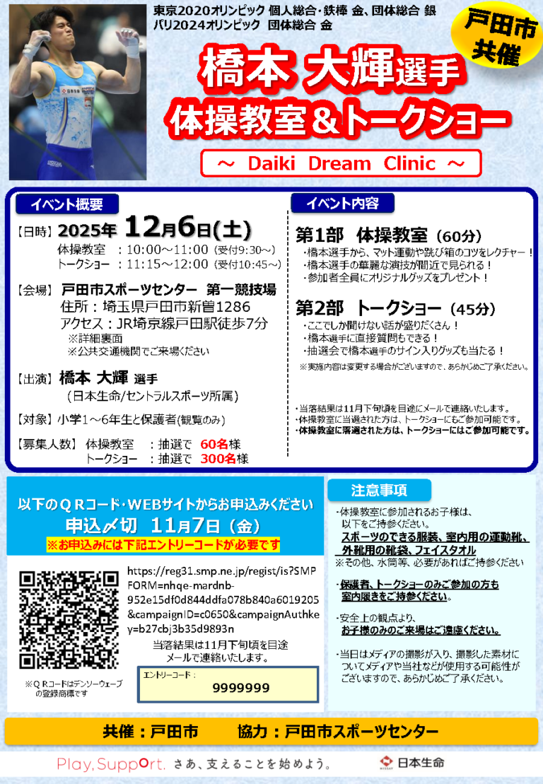埼玉県戸田市では、男子体操競技 オリンピック2大会連続金メダリストで、10月に行われた世界体操 男子個人総合で3連覇の快挙を達成した、橋本 大輝選手による「体操教室&トークショー」を開催します。