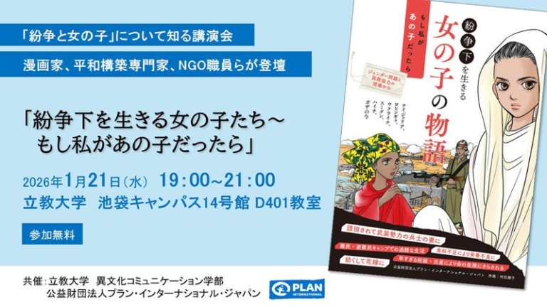 国際NGOプラン・インターナショナルKINDLE本「紛争下を生きる女の子の物語」発刊記念、紛争地の女の子の声が問いかける日本社会のジェンダー課題 国際NGOプラン・インターナショナル(所在地:東京都世田谷区、理事長:池上清子、以下プラン)は、紛争下で生きる女の子の声を集めたKINDLE書籍の発刊を記念し、トークイベント「紛争下を生きる女の子たち~もし私があの子だったら」を、立教大学との共催で2026年1月21日(水)に開催します。 紛争地から日本のキャンパスへ~昨年25周年を迎えたWPSの実…