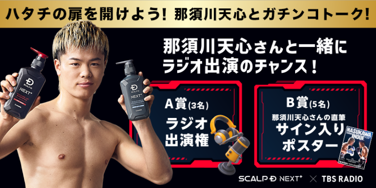 アンファー株式会社”天心かぶりつき席”での公開生放送に新成人リスナーをご招待! アンファー株式会社(本社:東京都千代田区、代表取締役社長:吉田南音 以下「アンファー」)が展開するメンズヘアケアブランド「スカルプD ネクストプラス」は、ブランドアンバサダー那須川天心選手と共に新成人の門出を祝う特別企画として、「TBSラジオ」と共同で「SCALP D presents 那須川天心のかんきもラジオ」の生放送に新成人リスナー様をご招待する「ハタチの扉を開けよう!那須川天心とガチンコトーク!」を実施します…