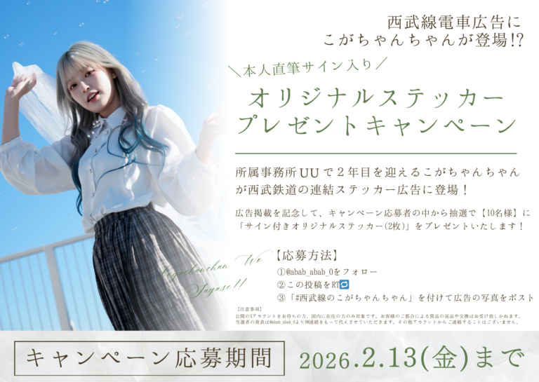 本広告の掲出を記念し、2026年2月13日(金)までの期間、X(旧Twitter)にてプレゼントキャンペーンを実施いたします。 「こがちゃんちゃん」は、SNSを中心に独自の世界観と高いエンゲージメントを持つインフルエンサーで、UU所属2年目を迎えました。今回の西武線電車広告への起用により、オンラインにと…