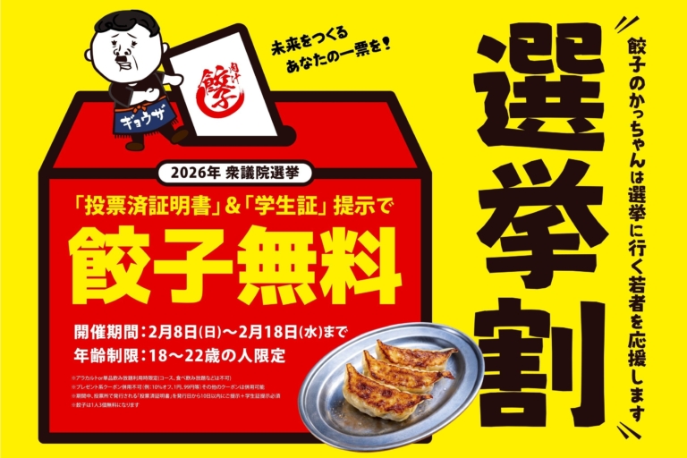 【学生注目!】投票に行ったら「餃子」がタダ!? 餃子のかっちゃんで2/8より期間限定の“センキョ割”がスタート