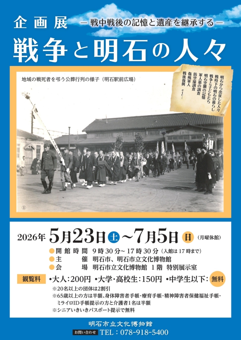 株式会社小学館集英社プロダクション(ShoPro)株式会社小学館集英社プロダクションが指定管理者として運営している明石市立文化博物館では、5月23日(土)より企画展「戦争と明石の人々―戦中戦後の記憶と遺産を継承する―」を開催します。 企画展「戦争と明石の人々―戦中戦後の記憶と遺産を継承する―」チラシ表面