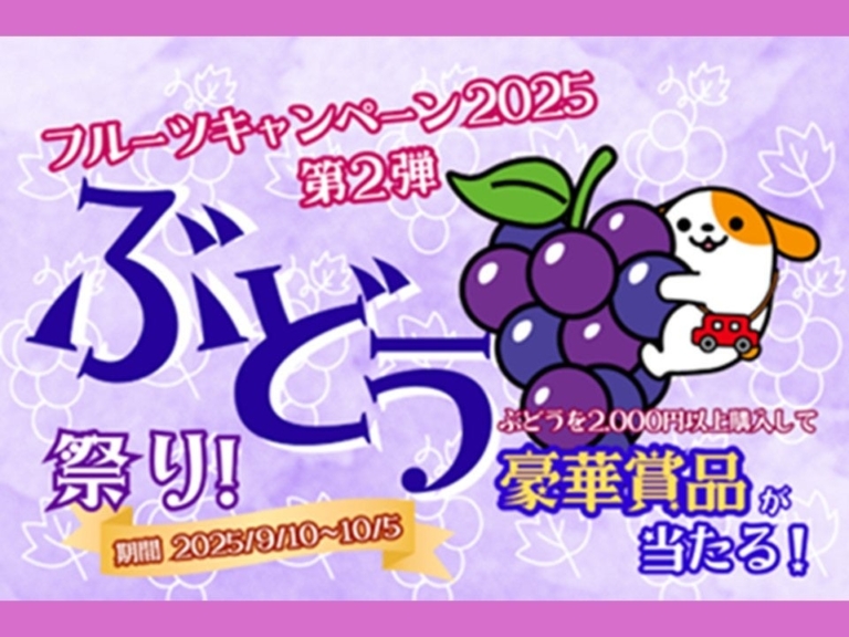 中日本エクシス株式会社~抽選で61組122名様に豪華賞品をプレゼント!~ 中日本エクシス株式会社 甲府支店(山梨県甲府市、支店長 柳田(やなぎだ) 真典(まさのり))は、E20 中央自動車道(中央道)における山梨県内の対象のサービスエリア(SA)・パーキングエリア(PA)にて、「フルーツキャンペーン2025第2弾 ぶどう祭り!」を9月10日~10月5日にわたり開催します。