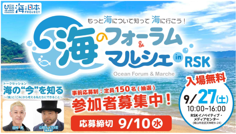 ソーシャルアクションネットワーク2025年9月27日(土) 10時~16時 <開催場所/RSKイノベイティブ・メディアセンター> 一般社団法人海と日本プロジェクト in 岡山は、9月27日(土)に「海のフォーラム&マルシェ in RSK」を開催いたします。このイベントは、次世代へ豊かで美しい海を引き継ぐために、海を介して人と人とがつながる“日本財団「海と日本プロジェクト」”の一環です。