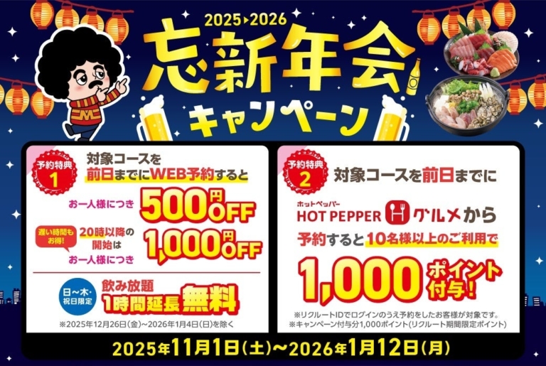 株式会社モンテローザおトクな特典が盛りだくさん!忘新年会は前日までの事前WEB予約が断然おトク!ご予約お待ちしております。 ご予約はこちらから 株式会社モンテローザ(本社:東京都杉並区、代表取締役:大神輝博)は、日頃のご愛顧に感謝し、2025年11月1日から2026年1月12日までの期間、全国の対象店舗で「忘新年会キャンペーン」を開催します。