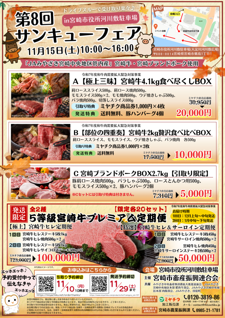 また、事前予約でうれしい特典も!会場引取りの方は、事前予約でミヤチク商品券をプレゼント!(Aセットは1,000円券×4枚、Bセットは1,000円…