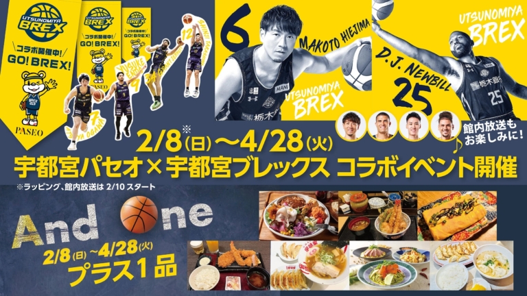 2月8日(日)から4月28日(火)までの期間、宇都宮パセオ(宇都宮ステーション開発株式会社)と宇都宮ブレックスのコラボ企画を実施します。