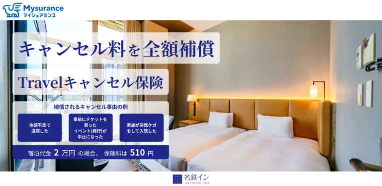 Mysurance株式会社~ 宿泊予約情報と個人情報の連携で、簡単・スムーズに保険加入 ~ 損害保険ジャパン株式会社の子会社で少額短期保険業を営むMysurance(マイシュアランス)株式会社(本社:東京都新宿区、代表取締役社長:清水 廣臣、以下「Mysurance」)は、名鉄イン株式会社(本社:愛知県名古屋市、代表取締役:二神 一、以下「名鉄イン」)が運営する名鉄インの公式予約サイトから宿泊予約をされるお客さま向けに、万が一宿泊をキャンセルされた場合にはキャンセル料が全額補償される「Trav…