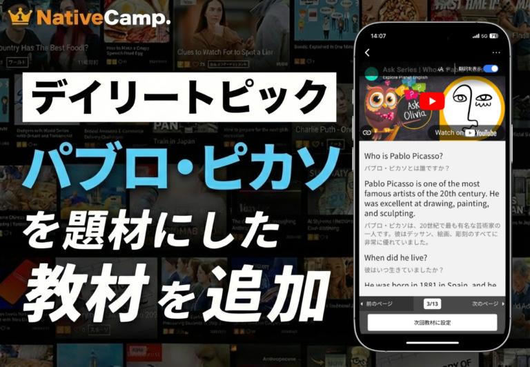 ネイティブスピーカーと回数無制限のオンライン英会話サービス「ネイティブキャンプ英会話」を展開する株式会社ネイティブキャンプ(東京都渋谷区 代表取締役:谷川国洋)は、2026年2月14日(土)、パブロ・ピカソをテーマにした新教材を追加しました。 パブロ・ピカソは20世紀で最も有名な芸術家の一人であり、デッサン、絵画、彫刻のすべてに優れていました。今回追加された教材では、1881年にスペインで生まれ、1973年にフランスで亡くなるまでの歩みをたどりながら、14歳で描いた写…