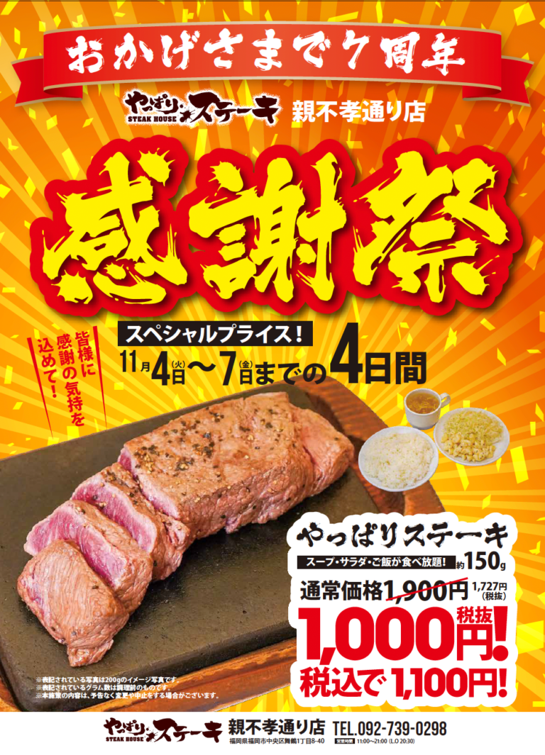 これは行くしかない!【やっぱりステーキ親不孝通り店】7周年大感謝祭!11/4から4日間限定で人気No.1ミスジステーキが1,000円!