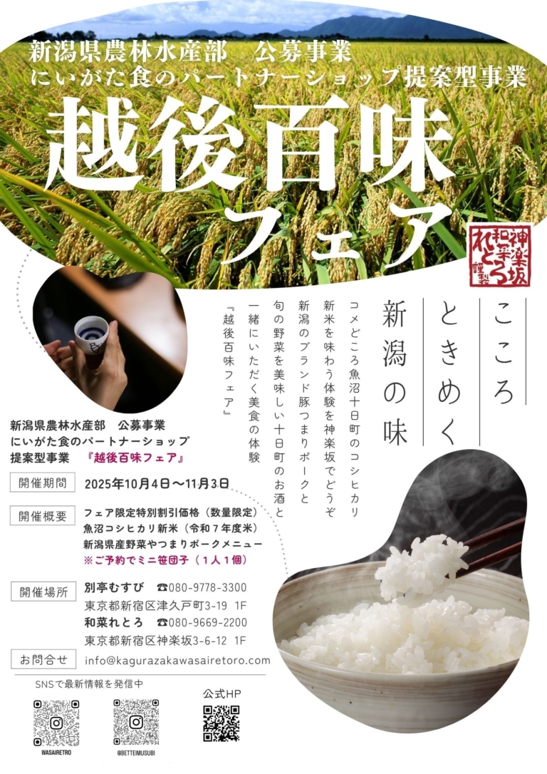 神楽坂が新潟に!特A魚沼コシヒカリ(新米)&幻の地酒がお試し価格に!神楽坂の2店舗で「越後百味フェア」が開催!