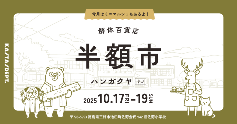 TCCO10月17日(金)~19日(日)、徳島県三好市・旧佐野小学校で開催― 建材リユース×地域交流。第1回(8月)延べ700名/第2回(9月)延べ600名が来場 ― 株式会社 TSUDA CONSTRUCTION COMPANY(本社:大阪府大阪市東淀川区、代表取締役:津田 直樹)は、徳島県三好市で運営する「解体百貨店 建築建材 ハンガクヤ」にて、『建築建材 半額市』を2025年10月17日(金)~19日(日)の3日間、旧佐野小学校で開催します。今回は校内でミニマルシェを同時開催。建材リユース…