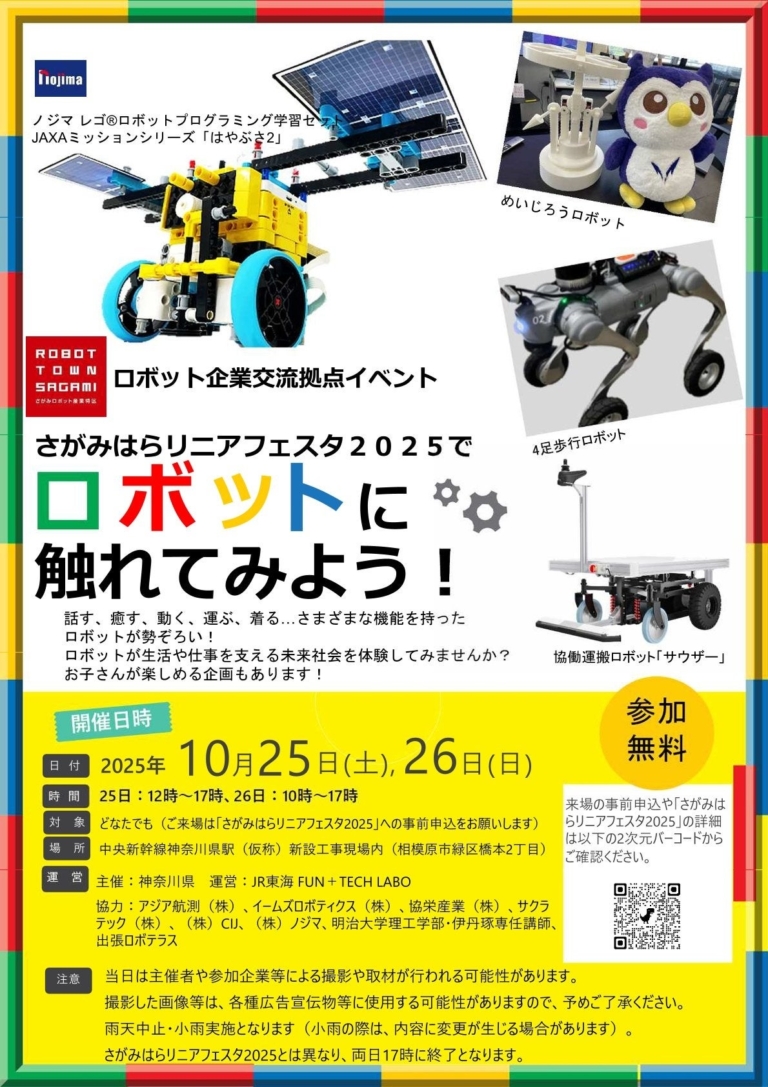 神奈川県「さがみはらリニアフェスタ2025」イベント内でロボット体験展示を行います! 話す、癒す、動く、運ぶ、着る…さまざまな機能を持ったロボットが勢ぞろい!ロボットが生活や仕事を支える未来社会を体験してみませんか? お子さんが楽しめる企画もあります! 1 実施日時
