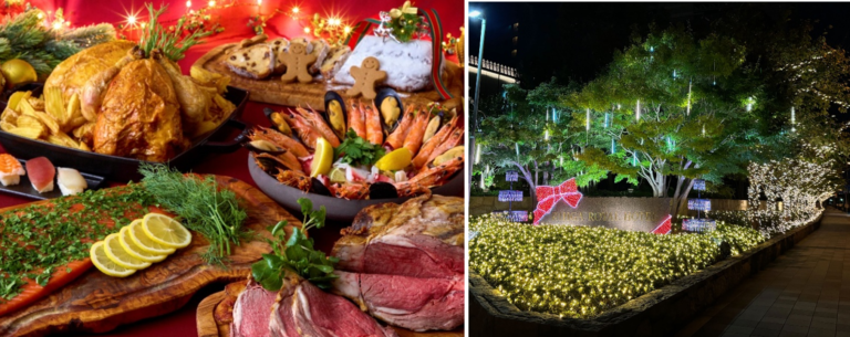 ロイヤルホテル約50,000球のイルミネーションがホテル前庭を彩る、冬の絶景スポットに。 左:クリスマスディナービュッフェ、右:ホテル前庭のイルミネーション