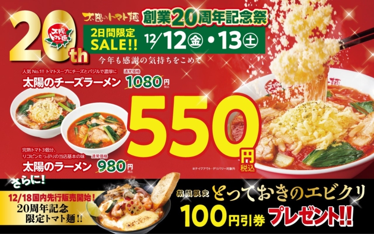 イートアンドHD~店頭では冬の限定メニュー割引券プレゼント~ トマトラーメンの専門店「太陽のトマト麺」(運営:株式会社一品香)は、創業20周年を記念し、2025年12月12日(金)、13日(土)の2日間限定で、『太陽のラーメン』と『太陽のチーズラーメン』を一律550円(税込)でご提供するキャンペーン「創業20周年記念祭」を国内全店(※)において開催いたします。また、ECサイトでは、2025年12月10日(水)から最大45%オフになる「創業20周年御礼大創業祭セール」を開催いたします。 トマトの…