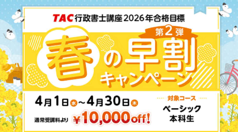 【TAC行政書士】4月から学習スタートで合格を狙う!『春の早割キャンペーン第2弾』実施中!