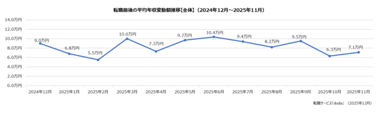 パーソルキャリア株式会社パーソルキャリア株式会社が運営する転職サービス「doda(デューダ)」(編集長:桜井 貴史)は、dodaエージェントサービスを利用して2025年11月に転職決定した個人の、転職前後の平均年収変動額と年収変動割合を発表いたします。 2025年11月のサマリ転職前後の平均年収変動額【全体】:+7.1万円(前月差:+0.8万円)
