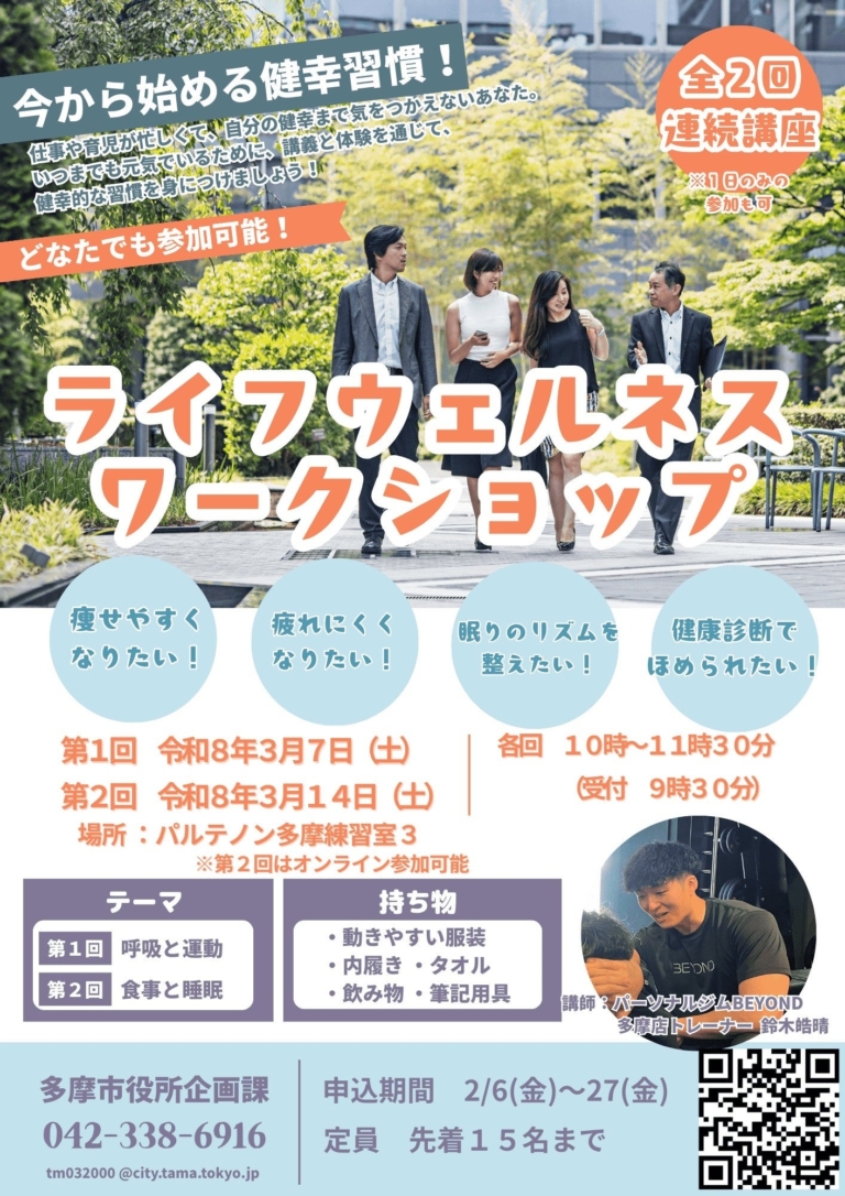 【多摩市×BEYOND】パーソナルジムが自治体とタッグ!「一生モノの健幸習慣」を学ぶワークショップが3月開催。食事・睡眠・呼吸のコツをプロが伝授