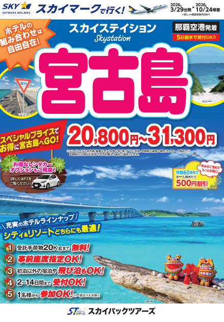 スカイパックツアーズ株式会社スカイマーク航空券とホテルがセットになった格安パッケージプラン『スカイステイション 宮古島』を販売開始!2026年4月1日開業の「キャノピーbyヒルトン沖縄宮古島リゾート」などラインナップが充実♪ スカイパックツアーズ株式会社(本社:東京都中央区、社長:横山正巳)は、スカイマークを利用した価格固定型のパンフレット旅行商品「スカイステイション 宮古島」【那覇空港発着】(2026年3月29日出発~2026年10月24日帰着)の販売を開始します。スカイマークだけを取り扱う専…