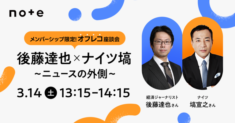 note株式会社後藤達也さんとの会員限定トークイベントも開催 お笑い芸人・ナイツの塙宣之さんが、2026年1月よりnoteメンバーシップを開始しました。 メンバーシップのスタートを記念し、経済ジャーナリストの後藤達也さんとの会員限定トークイベント「後藤達也 × ナイツ塙 ~ニュースの外側~」を、3月14日(土)に開催します。