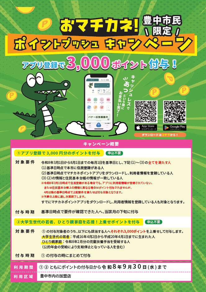 フェリカポケットマーケティング株式会社~申込不要のポイントプッシュキャンペーン&とよなかはぐくみポータルサイトとの連携も実施中~ フェリカポケットマーケティング株式会社(東京都文京区、代表取締役:納村哲二、以下当社)は、豊中市に対し、2022年10月より「マチカネポイントアプリ」を提供しております。このたび、同市が実施する市民生活支援および地域経済活性化施策として、2026年3月31日より「おマチカネ!ポイントプッシュキャンペーン」を開始しましたので、お知らせいたします。 本キャンペーンでは、…
