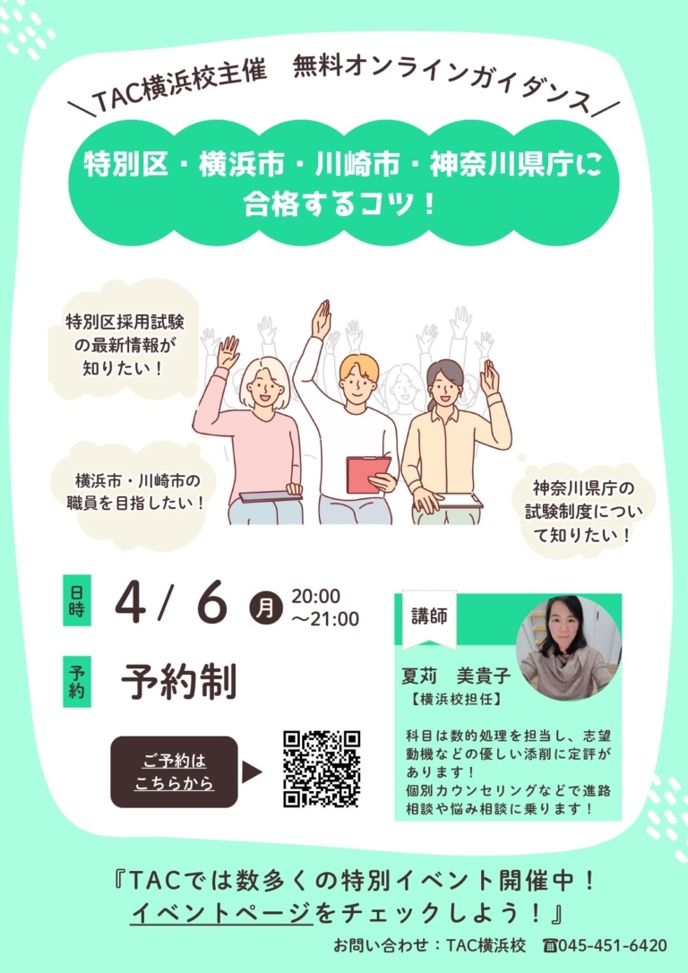 【TAC公務員】「特別区・横浜市・川崎市・神奈川県庁に合格するコツ!」を4/6(月)にオンラインで配信!